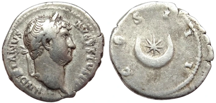 HADRIAN AR Denarius (134-138 AD). Star on crescent